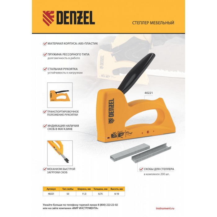 Степлер пластиковый, скобы в комплекте, тип 53, 6-10 мм Denzel (40221)
