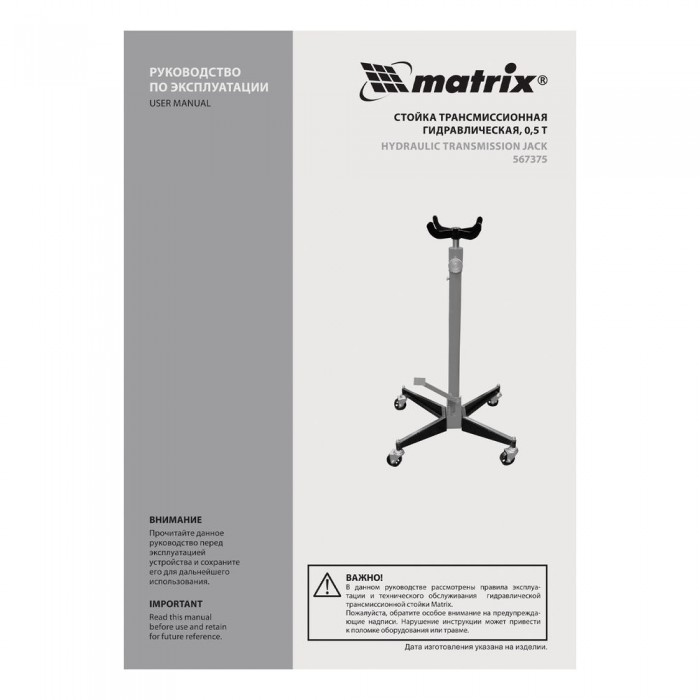 Стойка трансмиссионная гидравлическая, 0.5 т, H подъема 1130-1945 мм Matrix (567375)