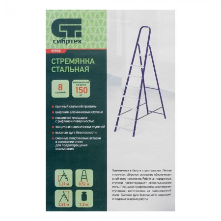 Стремянка, 8 ступеней, стальной профиль, алюминиевые ступени Сибртех (97958)