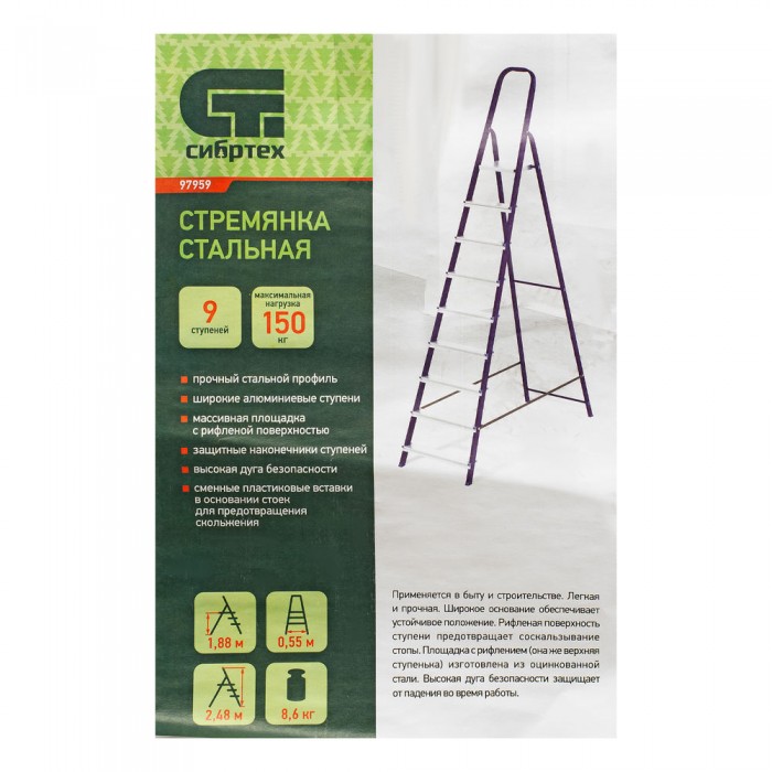 Стремянка, 9 ступеней, стальной профиль, алюминиевые ступени Сибртех (97959)