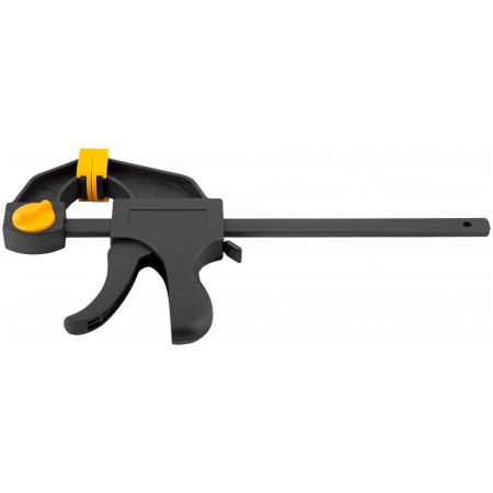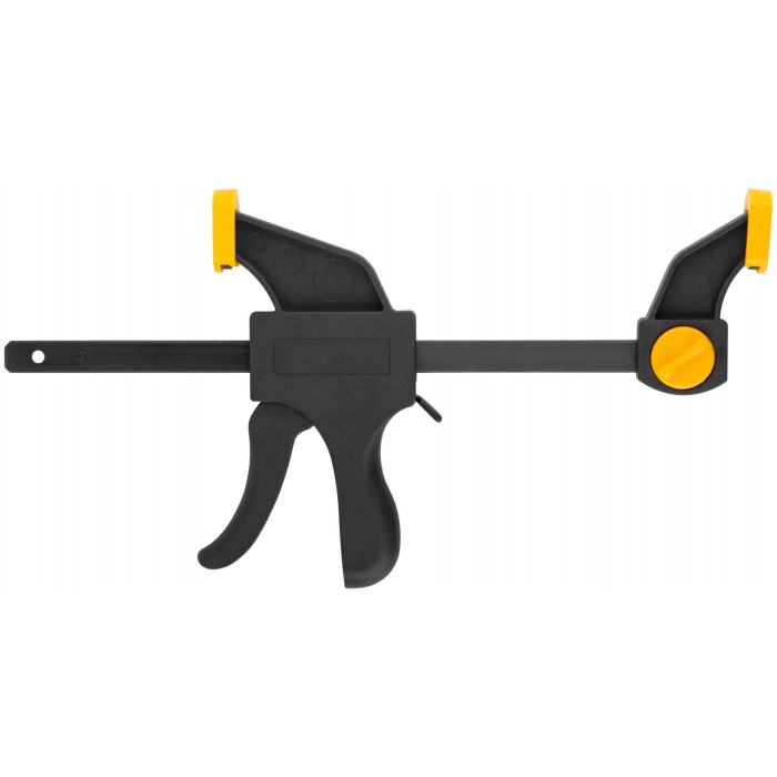 Быстрозажимная. Для фиксации деталей. Может использоваться как распорка при перестановке губок. Материал: нейлоновый корпус, армированный фибергласом, направляющая из инструментальной стали, пластиковые губки.