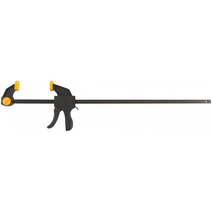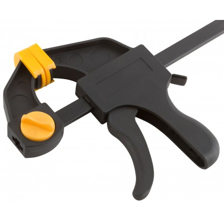 Быстрозажимная. Для фиксации деталей. Может использоваться как распорка при перестановке губок. Материал: нейлоновый корпус, армированный фибергласом, направляющая из инструментальной стали, пластиковые губки.