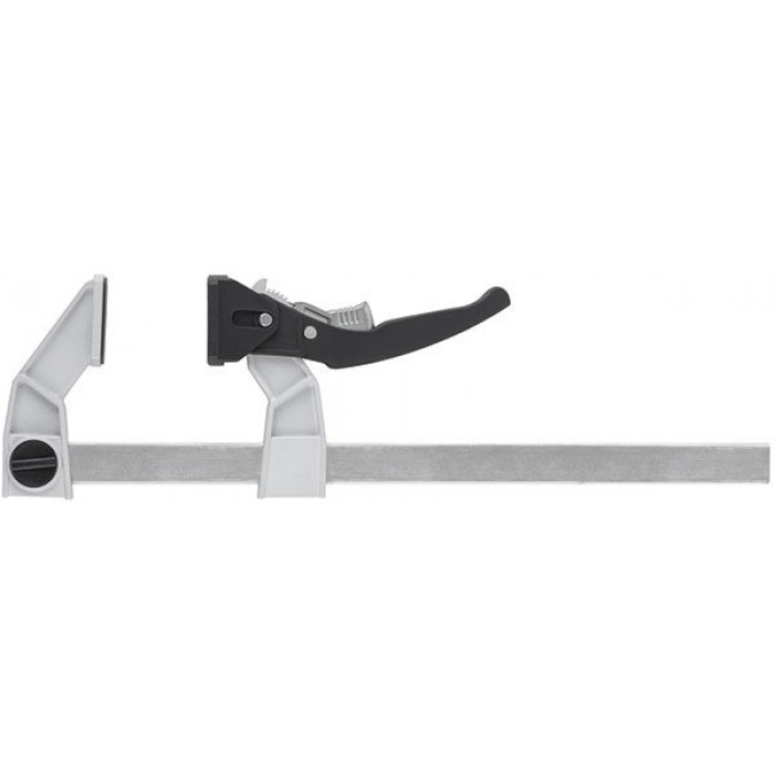 Профи. Для быстрой фиксации деталей при проведении столярных работ. Рычажный механизм с кнопкой быстрого сброса сжатия. Сила сжатия 200 кгс. Материал: рама из инструментальной стали, губки из алюминиевого сплава; ручка из полиамида, усиленного фибергласом; накладки на губки из нейлона.