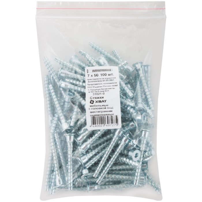 Стяжки мебельные (конфирмат) с головкой под шестигранник, оцинкованные 7 х 50 100 шт Фасовка (31021-0)