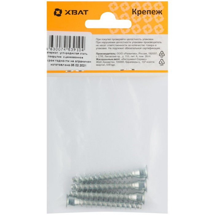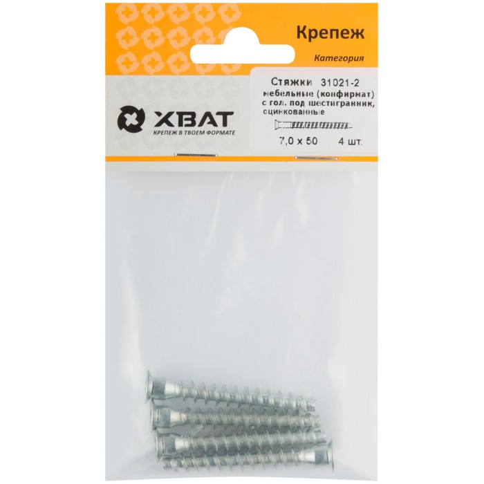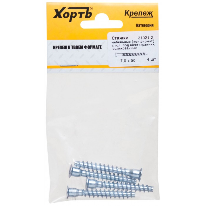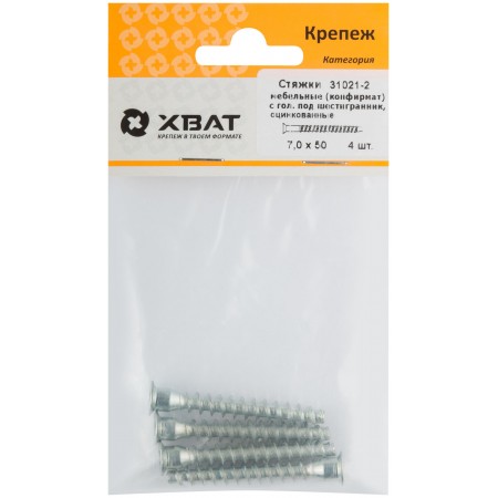 Стяжки мебельные (конфирмат) с головкой под шестигранник, оцинкованные 7 х 50 (фасовка 4 шт.) (31021-2)