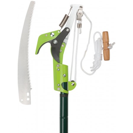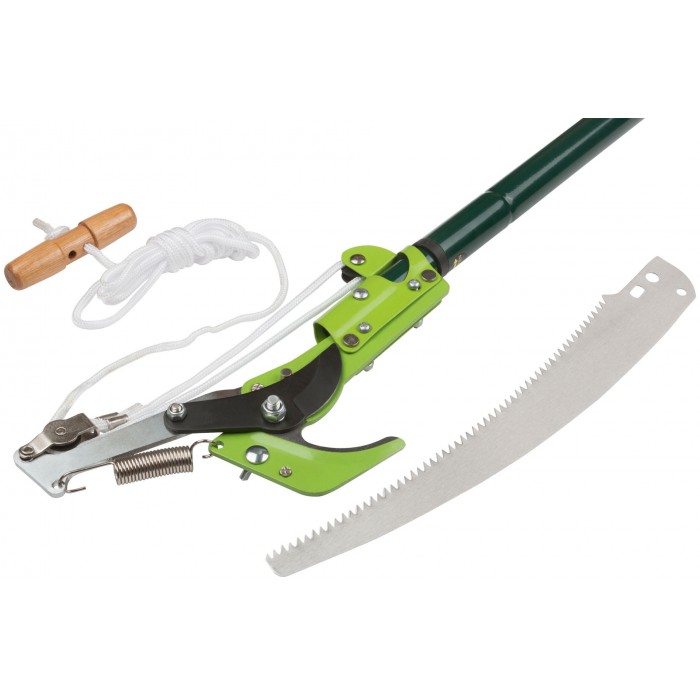 С удлиняющей телескопической ручкой. Применяется для ухода за кронами деревьев, а также за ветками, расположенными высоко от земли. Длина пилы 330 мм. Материал: сталь, лезвия из высокоуглеродистой стали с тефлоновым покрытием, пила из 65 Mn стали, ручка из углеродистой стали. L веревки = 2600 мм. Упаковка: блистер.