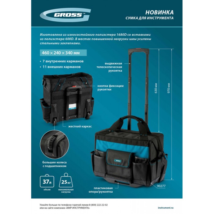 Сумка для инструмента, 460х240х340мм, выдвижная рукоятка, колеса Gross