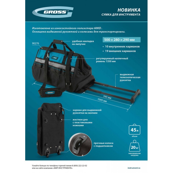 Сумка для инструмента, 500х280х290мм, выдвижная рукоятка, колеса, наплечный ремень Gross