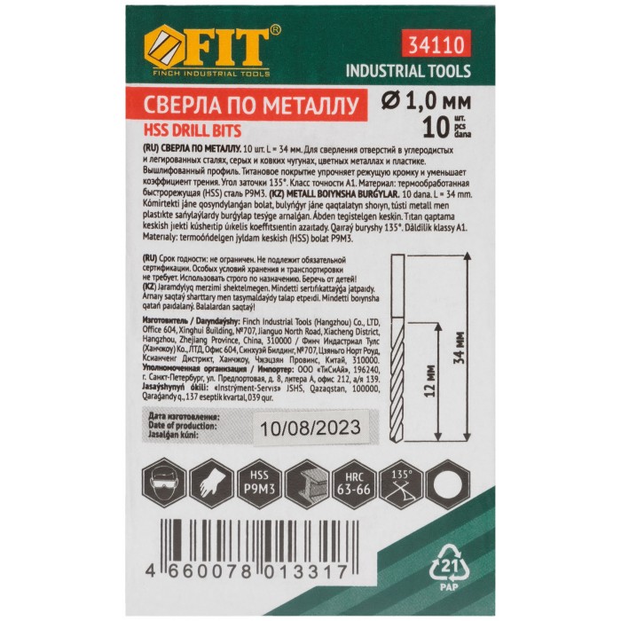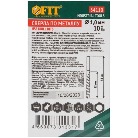 Сверла HSS по металлу, титановое покрытие 1,0 мм (10 шт.) (34110)