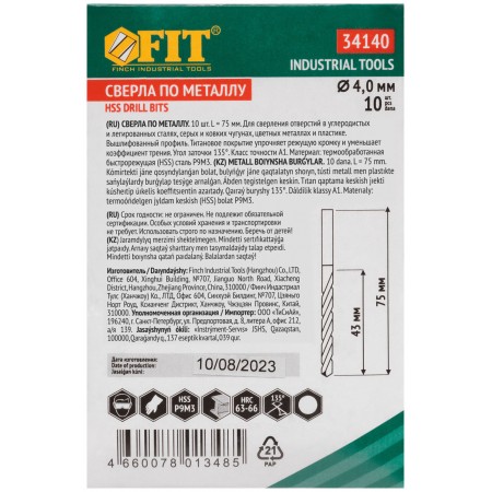 Сверла HSS по металлу, титановое покрытие 4,0 мм (10 шт.) (34140)