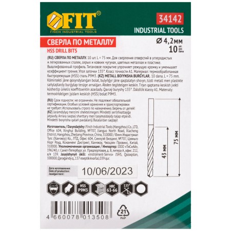 Сверла HSS по металлу, титановое покрытие 4,2х75 мм (10 шт.) (34142)