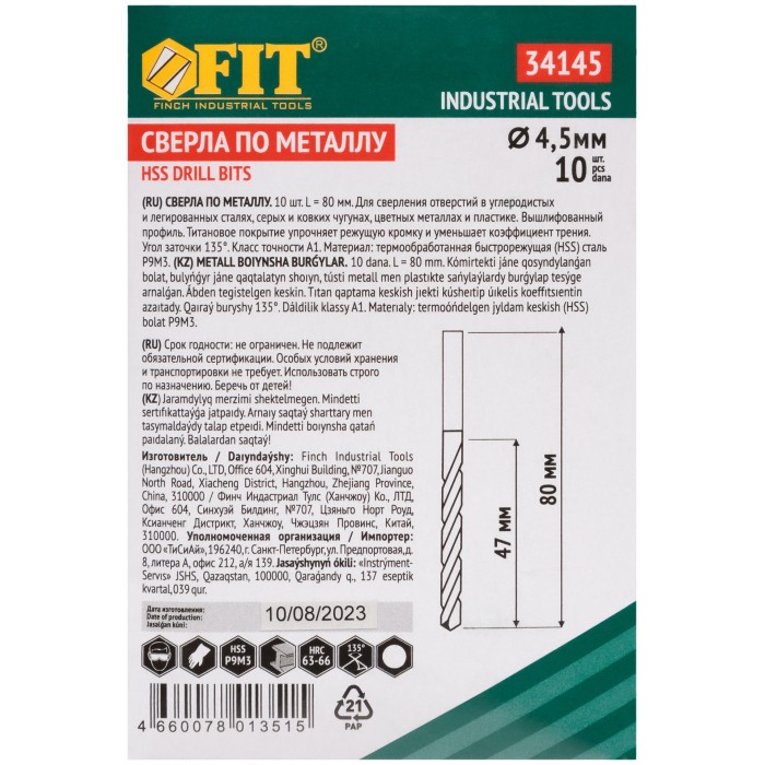 Сверла HSS по металлу, титановое покрытие 4,5 мм (10 шт.) (34145)