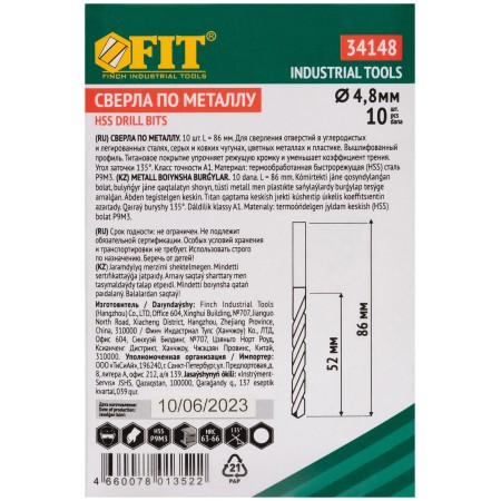 Сверла HSS по металлу, титановое покрытие 4,8 мм (10 шт.) (34148)