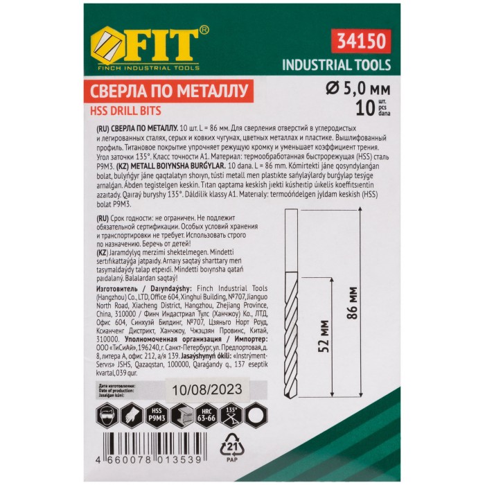 Сверла HSS по металлу, титановое покрытие 5,0 мм (10 шт.) (34150)