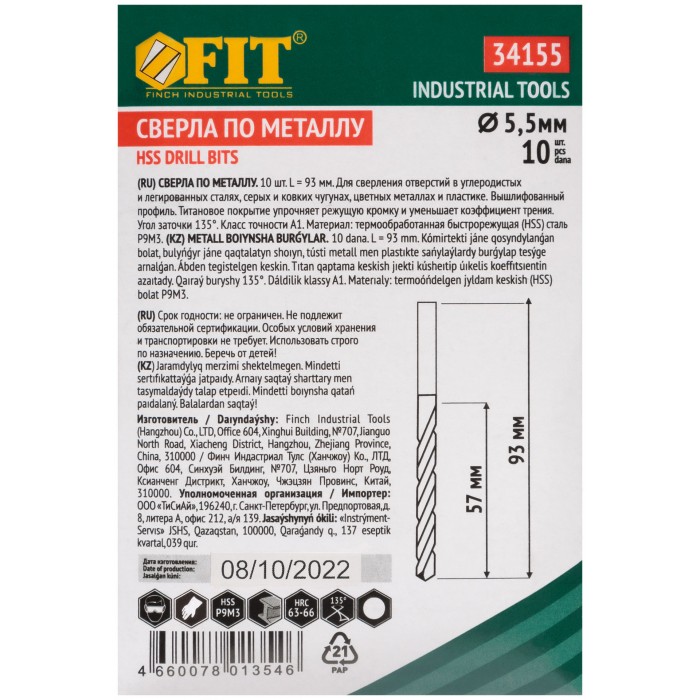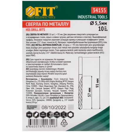 Сверла HSS по металлу, титановое покрытие 5,5 мм (10 шт.) (34155)