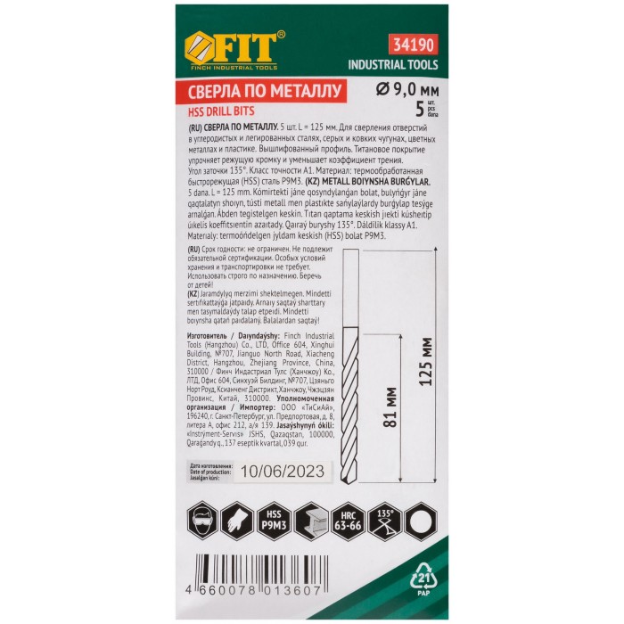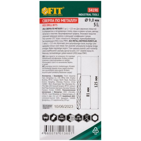 Сверла HSS по металлу, титановое покрытие 9,0 мм ( 5 шт.) (34190)