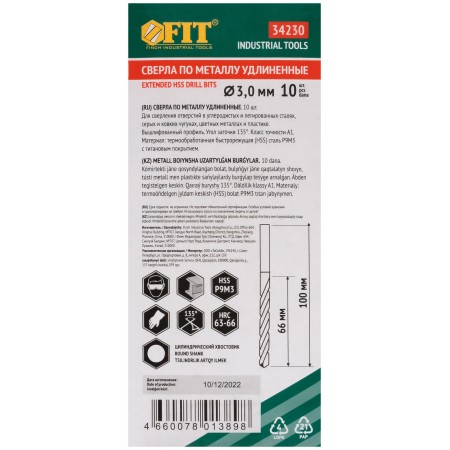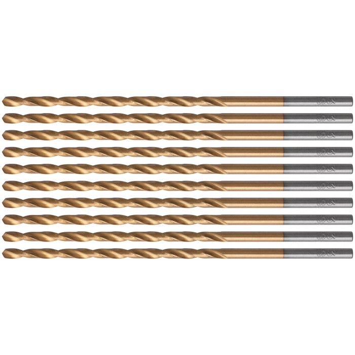 Сверла HSS по металлу, удлиненные, титановое покрытие 3,0х100 мм (10 шт.) (34230)
