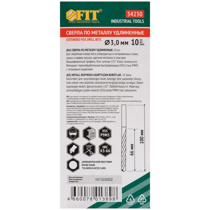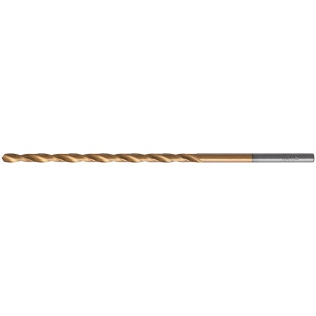 DIN 340, удлиненное. Цилиндрический хвостовик. Вышлифованный профиль. Класс точности А1. УголBзаточки 135 градусов. Материал: быстрорежущая (HSS) сталь Р9М3 c титановым покрытием. Упаковка: картонный конверт.