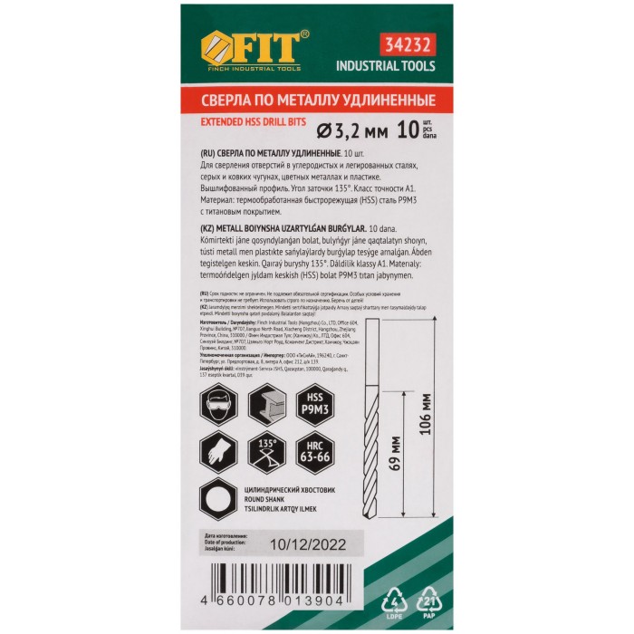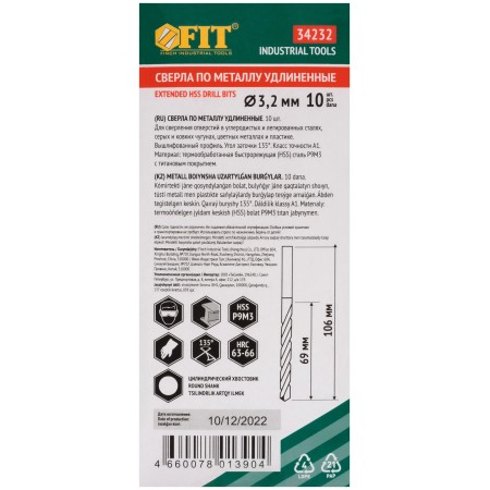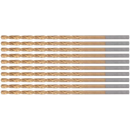 Сверла HSS по металлу, удлиненные, титановое покрытие 3,2х106 мм (10 шт.) (34232)