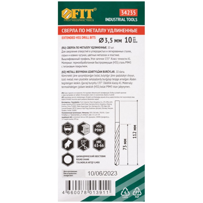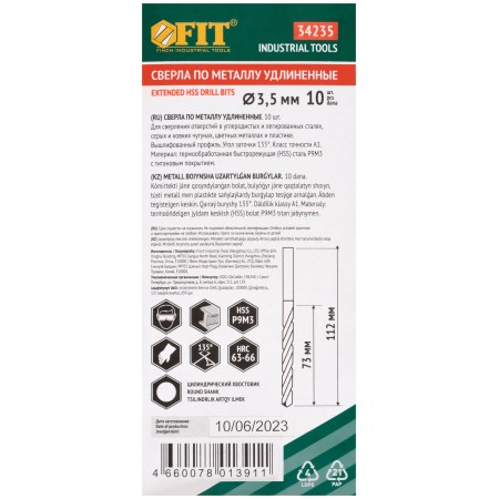 Сверла HSS по металлу, удлиненные, титановое покрытие 3,5х112 мм (10 шт.) (34235)
