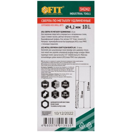 Сверла HSS по металлу, удлиненные, титановое покрытие 4,2х119 мм (10 шт.) (34242)