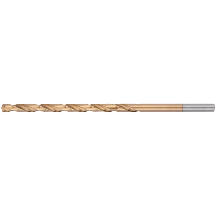DIN 340, удлиненное. Цилиндрический хвостовик. Вышлифованный профиль. Класс точности А1. УголBзаточки 135 градусов. Материал: быстрорежущая (HSS) сталь Р9М3 c титановым покрытием. Упаковка: картонный конверт.