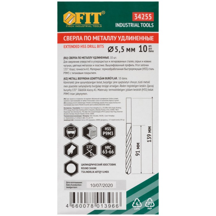 Сверла HSS по металлу, удлиненные, титановое покрытие 5,5х139 мм (10 шт.) (34255)