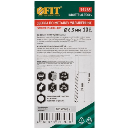 Сверла HSS по металлу, удлиненные, титановое покрытие 6,5х148 мм (10 шт.) (34265)