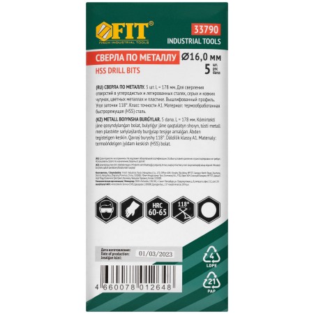 Сверла по металлу HSS полированные 16,0х178 мм (5 шт.) (33790)