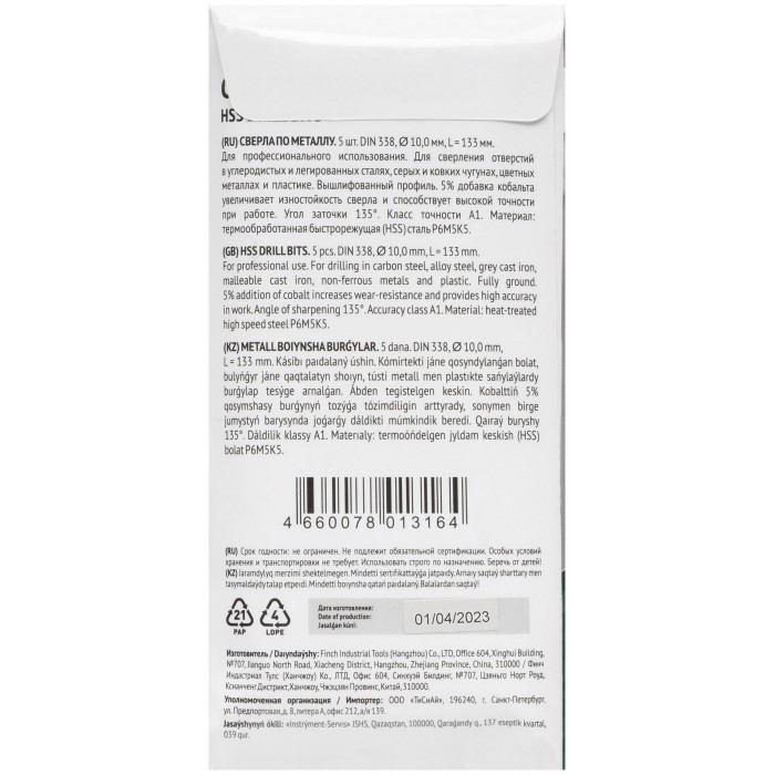 Профи. DIN338. С 5% добавкой кобальта. Для профессионального использования. Класс точности А1. Угол заточки 135 градусов. Цилиндрический хвостовик. Вышлифованный профиль. Износостойкие. Материал: быстрорежущая (HSS) сталь Р6М5К5. Упаковка: картонный конверт.