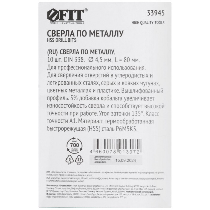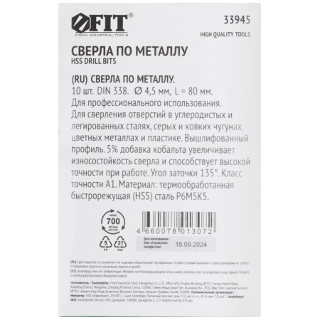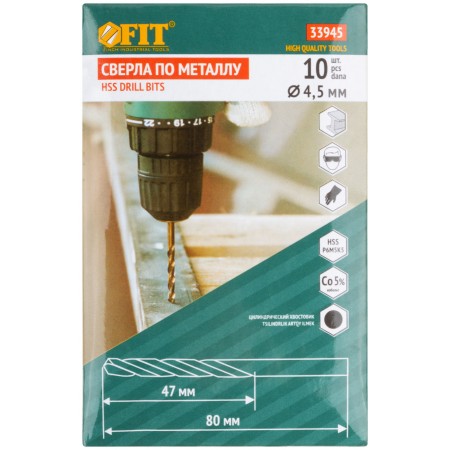 Сверла по металлу HSS с добавкой кобальта 5% Профи 4,5 мм (10 шт.) (33945)
