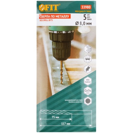 Сверла по металлу HSS с добавкой кобальта 5% Профи 8,0 мм ( 5 шт.) (33980)