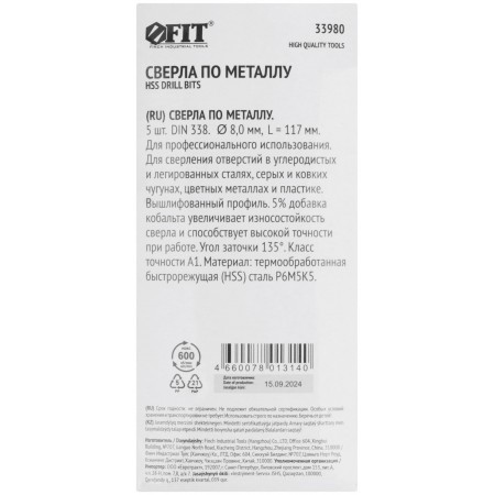 Профи. DIN338. С 5% добавкой кобальта. Для профессионального использования. Класс точности А1. Угол заточки 135 градусов. Цилиндрический хвостовик. Вышлифованный профиль. Износостойкие. Материал: быстрорежущая (HSS) сталь Р6М5К5. Упаковка: картонный конверт.