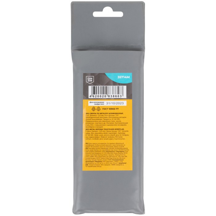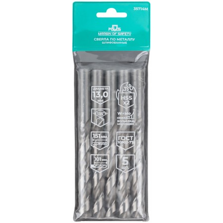 Сверла по металлу HSS шлифованные, угол заточки 135°, 13,0 x 151 мм (5 шт.) (35714М)