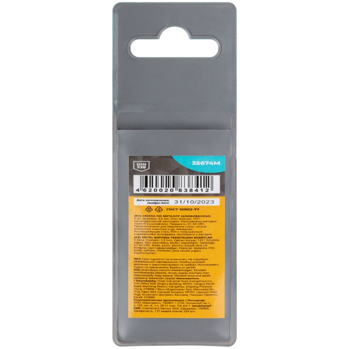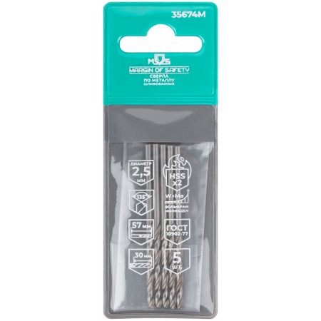 Сверла по металлу HSS шлифованные, угол заточки 135°, 2.5 x 57 мм (5 шт.) (35674М)