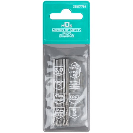 Сверла по металлу HSS шлифованные, угол заточки 135°, 3,0 x 61 мм (5 шт.) (35677М)
