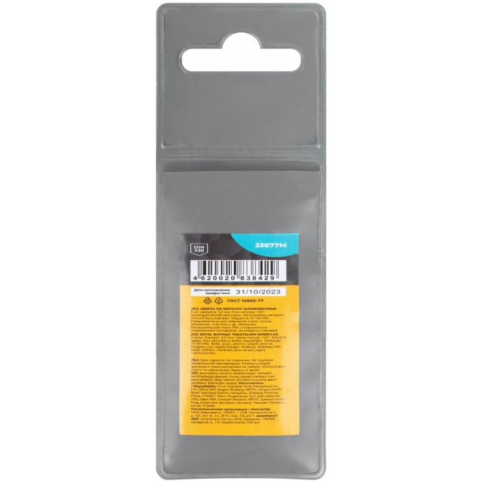 DIN338. Цилиндрический хвостовик.Изготовленно методом полной вышлифовки. Угол заточки 135°. Твердость: 61-64HRC. Материал: быстрорежущая сталь с повышенным содержанием вольфрама, молибдена и ванадия. Упаковка: пакет с подвесом.