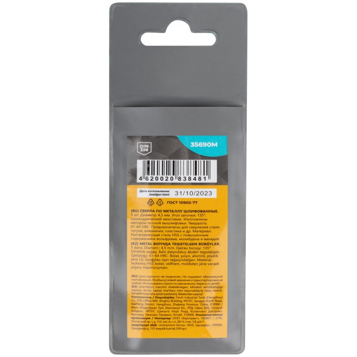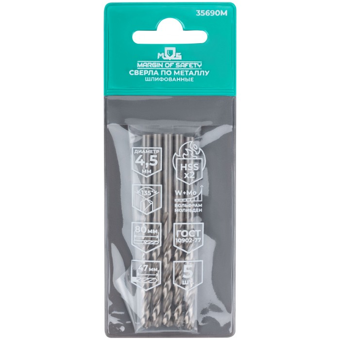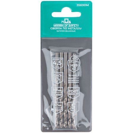 Сверла по металлу HSS шлифованные, угол заточки 135°, 4,5 x 80 мм (5 шт.) (35690М)