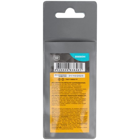 DIN338. Цилиндрический хвостовик.Изготовленно методом полной вышлифовки. Угол заточки 135°. Твердость: 61-64HRC. Материал: быстрорежущая сталь с повышенным содержанием вольфрама, молибдена и ванадия. Упаковка: пакет с подвесом.