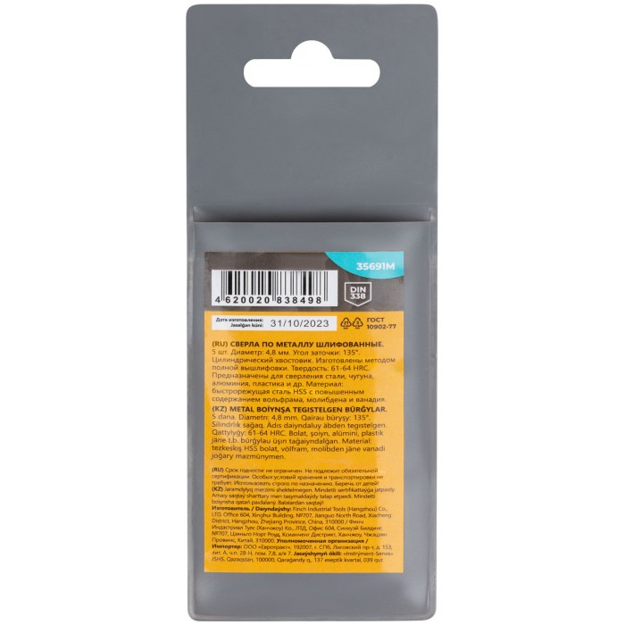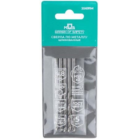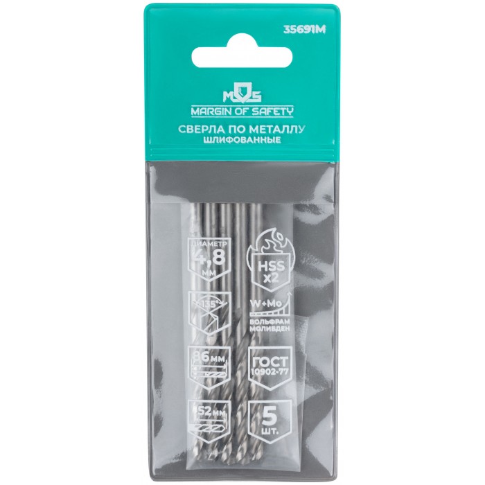 Сверла по металлу HSS шлифованные, угол заточки 135°, 4,8 x 86 мм (5 шт.) (35691М)