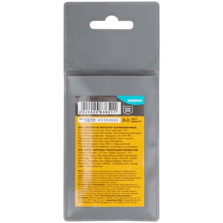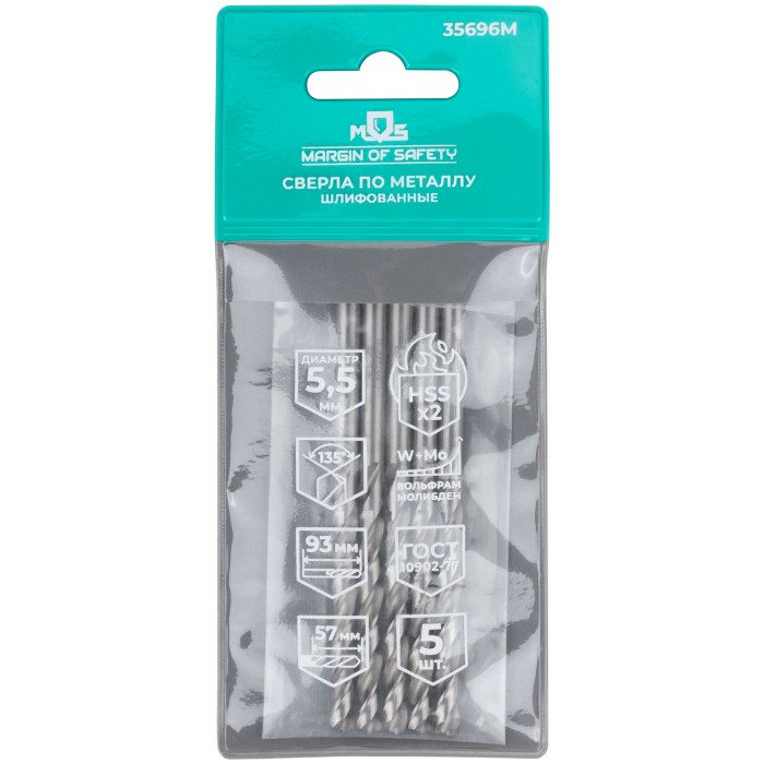 Сверла по металлу HSS шлифованные, угол заточки 135°, 5,5 x 93 мм (5 шт.) (35696М)