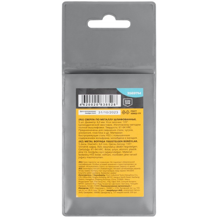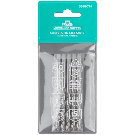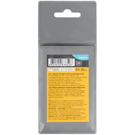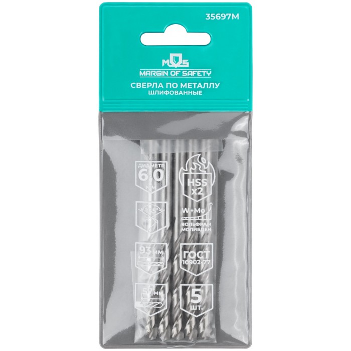 Сверла по металлу HSS шлифованные, угол заточки 135°, 6,0 x 93 мм (5 шт.) (35697М)