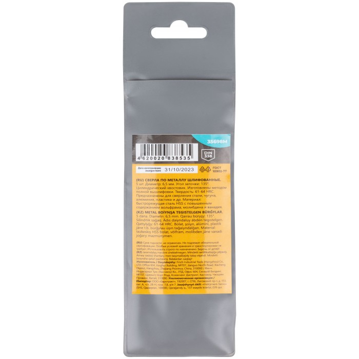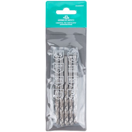 Сверла по металлу HSS шлифованные, угол заточки 135°, 6,5 x 101 мм (5 шт.) (35698М)