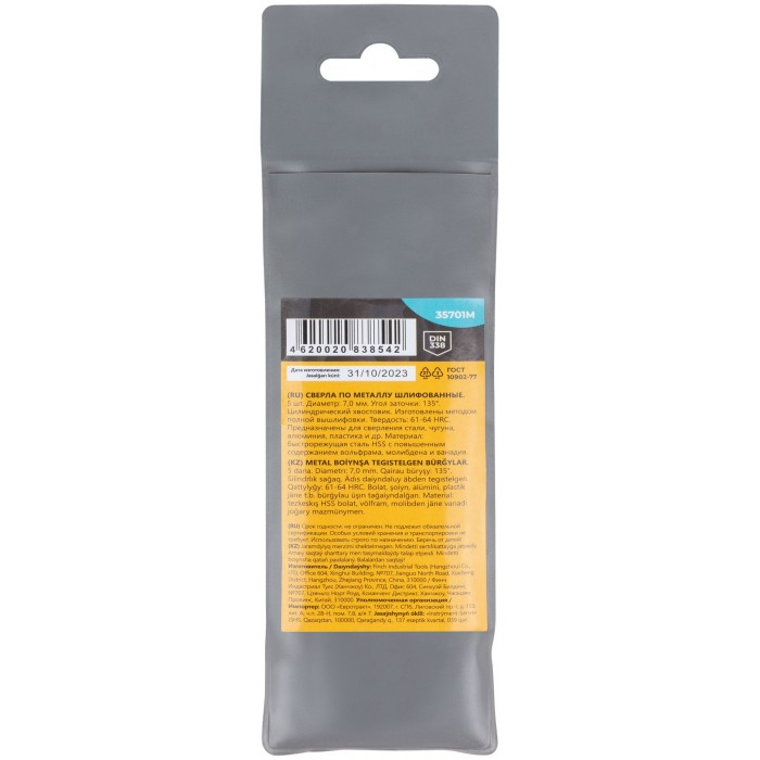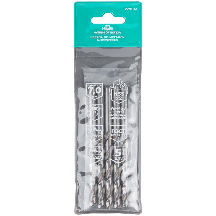 Сверла по металлу HSS шлифованные, угол заточки 135°, 7,0 x 109 мм (5 шт.) (35701М)