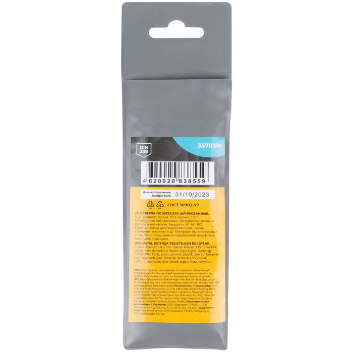 DIN338. Цилиндрический хвостовик.Изготовленно методом полной вышлифовки. Угол заточки 135°. Твердость: 61-64HRC. Материал: быстрорежущая сталь с повышенным содержанием вольфрама, молибдена и ванадия. Упаковка: пакет с подвесом.