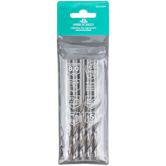 Сверла по металлу HSS шлифованные, угол заточки 135°, 8,0 x 117 мм (5 шт.) (35703М)