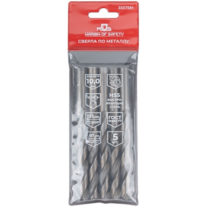 Сверла по металлу HSS, угол заточки 118°, 10,0 x 133 мм, (5 шт.) (35575М)