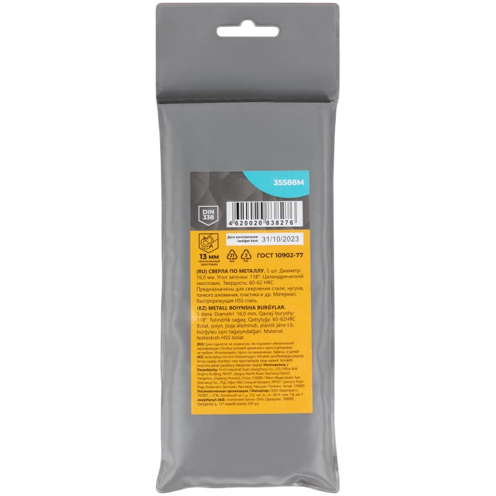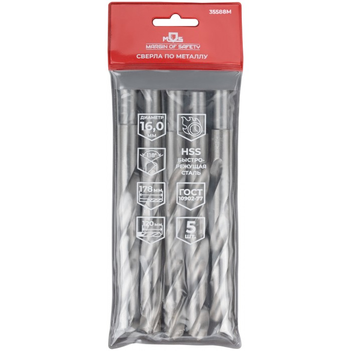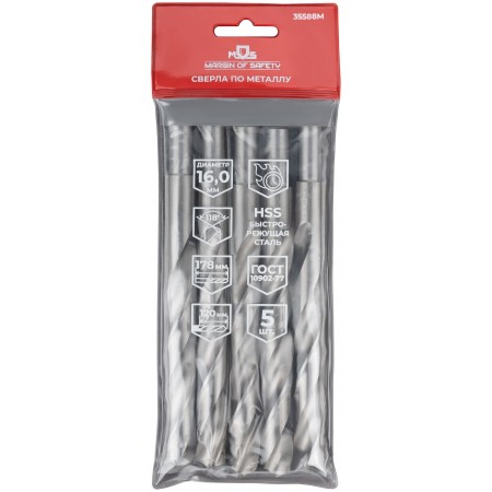 Сверла по металлу HSS, угол заточки 118°, 16,0 x 178 мм, (5 шт.) (35588М)