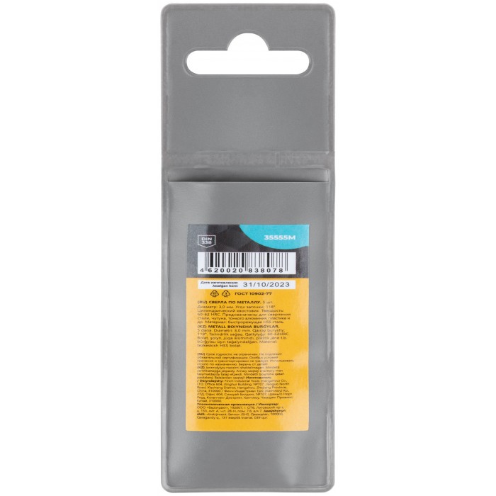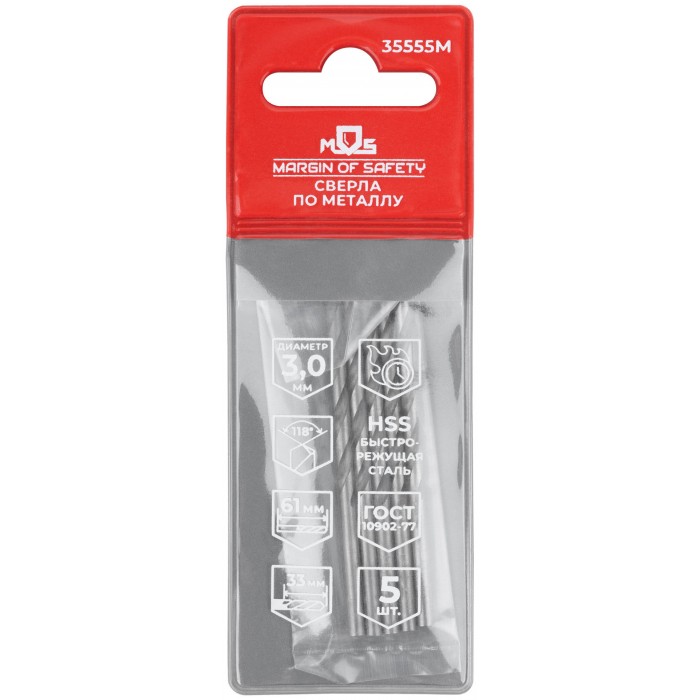 Сверла по металлу HSS, угол заточки 118°, 3,0 x 61 мм, (5 шт.) (35555М)