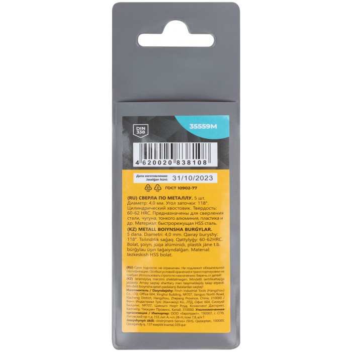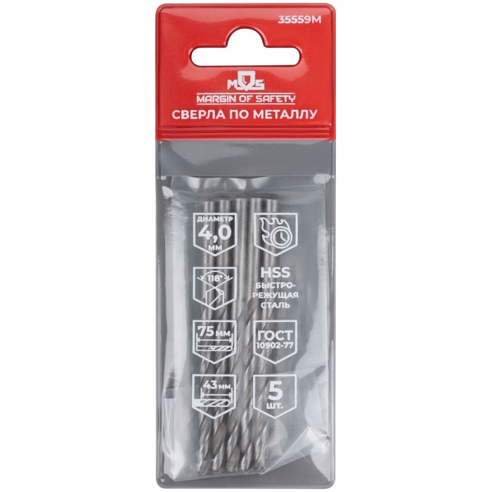 Сверла по металлу HSS, угол заточки 118°, 4,0 x 75 мм, (5 шт.) (35559М)